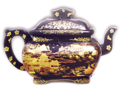 宜興窯紫砂黑漆描金吉慶有余壺 清乾隆