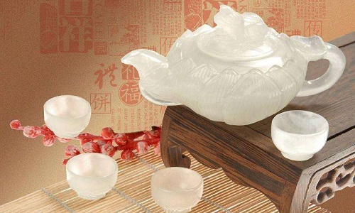 玉質(zhì)茶具的原料包括真玉(軟玉和硬玉)、綠松石、瑪瑙、水晶、孔雀石、琥珀、紅綠寶石等彩石玉,多制成壺、罐、杯、盞、盅、蓋碗等。