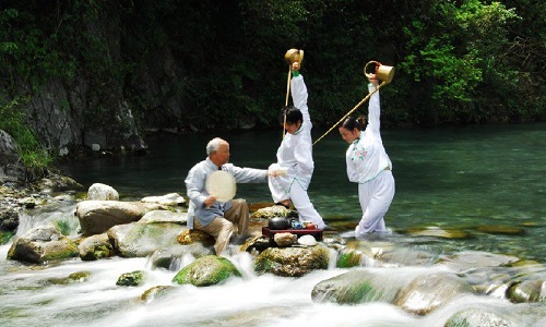 還有一些高雅的茶藝表演,是蒙頂山“禪茶”中所獨創(chuàng)的十八道獻茶技藝。相傳“龍行十八式”茶技是北宋高僧禪惠大師在蒙頂山結(jié)廬清修時所創(chuàng)。過去作為僧人修行的一門功課,“龍行十八式”茶藝只在蒙頂山僧人中流傳,直到清代才逐漸傳入民間。創(chuàng)下融茶道、武術(shù)、舞蹈、禪學、易理為一體的茶技-蒙頂派“龍行十八式”。佛教文化和茶文化的水乳交融,更奠定了蒙山作為世界茶文化圣山的至尊地位。