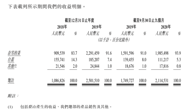招股書顯示,2018年、2019年,奈雪的茶營業(yè)收入分別為9.1億元,22.91億元,2019年前三季度、2020年前三季度營收分別為15.92億元、19.85億元,2019年之后,該業(yè)務(wù)營收貢獻(xiàn)占營收總金額的比例提升至91%以上。