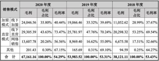 從銷售模式來看,八馬茶業(yè)采取的是“直營(yíng)+加盟”、“線上+線下”的全渠道銷售體系。截至2020年末,公司門店數(shù)量超過2000家,其中直營(yíng)店366家,加盟店超1700家。雖然,加盟店數(shù)量遠(yuǎn)超直營(yíng)店數(shù)量,但由于線下加盟模式的毛利率只有40%,遠(yuǎn)低于線下直營(yíng)模式73%的毛利率。因此,366家直營(yíng)店貢獻(xiàn)的毛利與超過1700家加盟店貢獻(xiàn)的利潤(rùn)大體相當(dāng)。