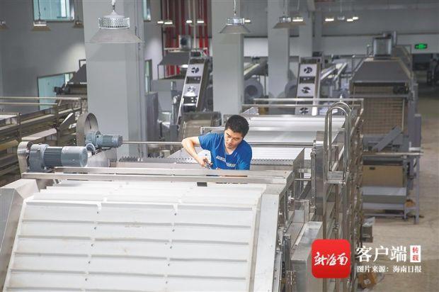 6月16日,在海墾茶業(yè)生態(tài)科技園(一期)項目現(xiàn)場,工人們正在抓緊安裝、調試剛進場的紅茶、綠茶生產(chǎn)線。