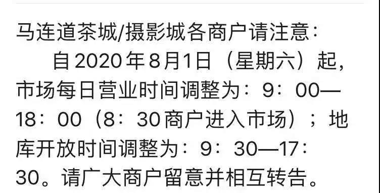 7月22日起,馬連道二商集團(tuán)旗下的國(guó)際茶城、京華緣茶城、天福緣市場(chǎng)已恢復(fù)正常營(yíng)業(yè),每天營(yíng)業(yè)時(shí)間為9:00-19:00,進(jìn)入茶城須出示健康寶,不必進(jìn)行體溫檢測(cè)。